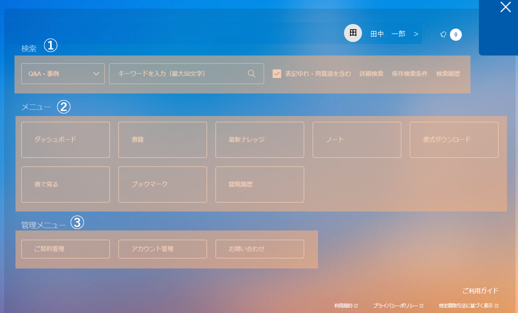 メニューからリーガルコネクションの各機能へ移動できます。
