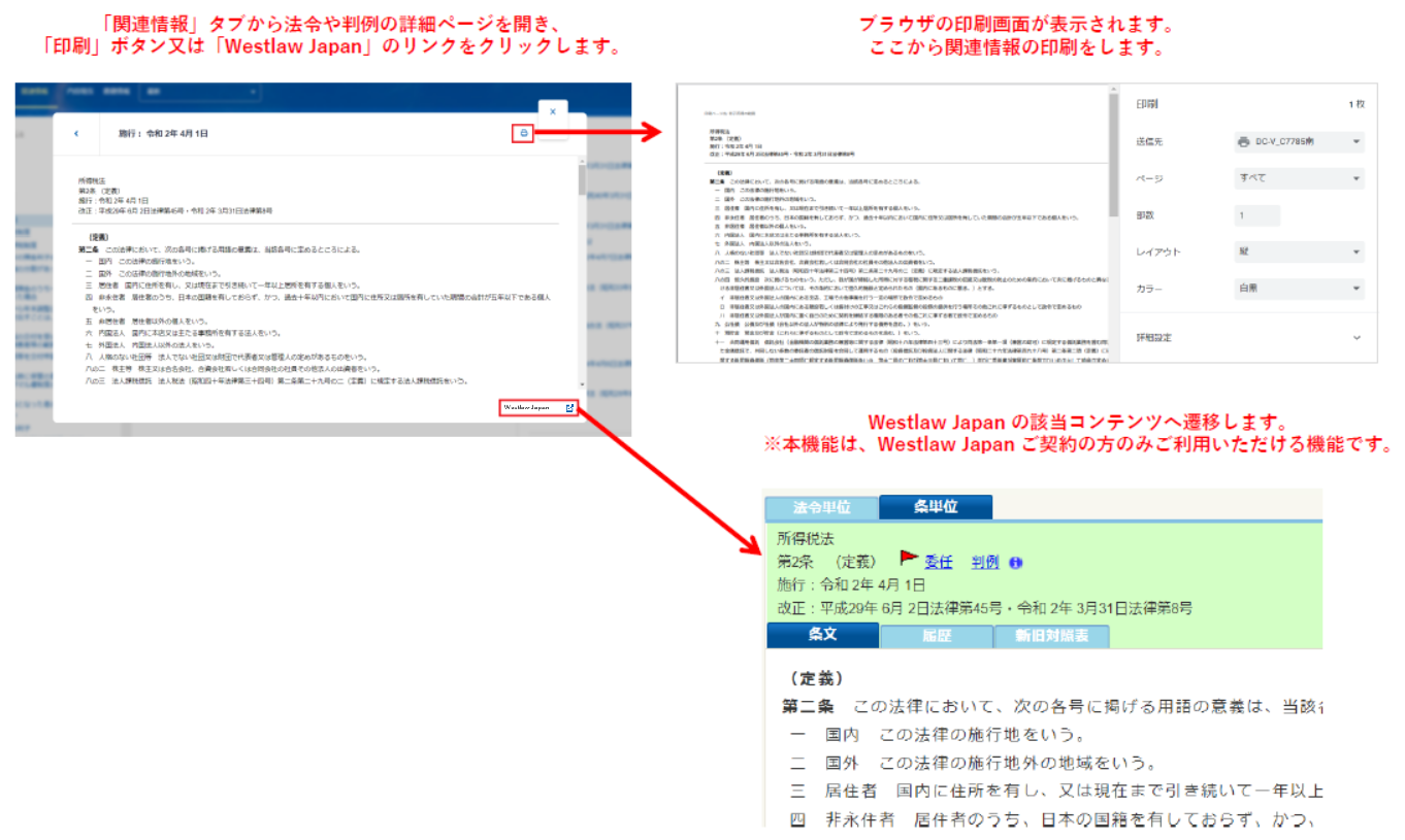 関連情報 印刷機能とWestlaw Japanへのリンク(PC版のみ)