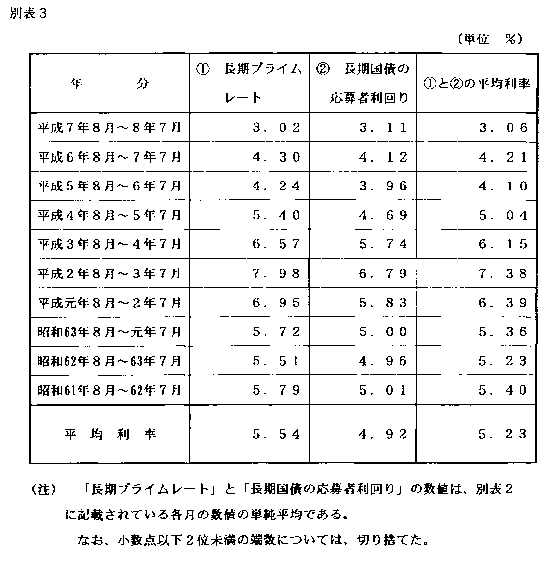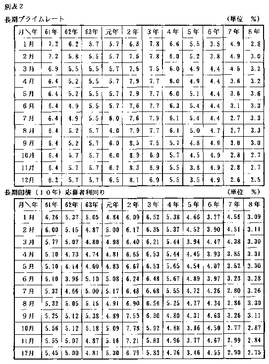 (ロ)日本銀行調査統計局発行の「経済統計年報」に掲載されている長期プライムレートと長期国債(10年)の応募者利回りの昭和61年1月から平成8年12月までの各月の利率の推移は別表2のとおりである。
