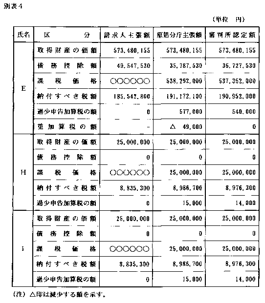 (ハ)したがって、H及びIの過少申告加算税の額は別表4の「審判所認定額」欄の金額となり、この金額は過少申告加算税の賦課決定処分の金額に満たないから、過少申告加算税の賦課決定処分はその一部を取り消すべきである。