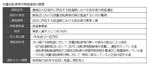 こんな中、5月12日の日本経済新聞朝刊の「経済教室」に、東京大学教授 中里実氏の「法定外税の狙い撃ち懸念」という論文が掲載された。この中で、中里教授は、「最近の法定外税の中で特に問題と思われる東京都豊島区の放置自転車税」と指摘し、同税を厳しく批判した。具体的には、①当該地方自治体の構成員全体で広く薄く負担する方式こそ課税自主権行使のあり方としてまっとうな道である、②特定の鉄道事業者のみを狙い撃ちにするような、政治的意図に基づく「選別的課税」をするべきではない、③自転車法の協力義務を超えて課税することは、憲法94条に違反する疑いが濃厚である、などという主張だ。しかし、この論文に対して豊島区長は、「政治的な圧力があるのではないか。」との認識を示し、特別な反応を示さなかった。