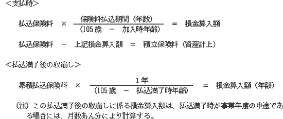 なお、保険料の払込期間が満了した場合は、満了までの積立保険料の累積額を「105歳と払込満了時年齢との差」で除した金額を取り崩して、損金算入する(下記算式)。