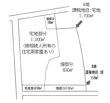 この土地は、市中心部の南西約7kmに所在し、農業地帯の中に一般住宅が混在する地域である。住宅地図・公図を見る限りでは周辺の標準的な宅地の規模は300m2前後と思われる。上記A地の地目は宅地、B地の地目は畑であるが、実際の利用状況は図のようにA地・B地ともそれぞれ宅地部分と畑部分に分かれている。周辺にマンションはなく、現在建築工事中のものも見当たらない。