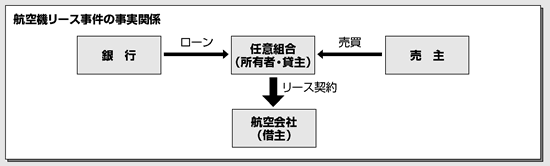 次に航空機リース事件として全国で裁判所や不服審判所に係属した事件は、個人が組合員となったものであるが、おおむね次の仕組を有する。現金を出資した組合員が任意組合を組成し、任意組合は銀行より融資を受けたうえ、組合員の出資金と合わせて航空機1機を市場より購入し、外国の航空会社にリースし、リース期間終了時には航空機を市場で売却して、航空機の賃貸事業を行なうというものである(脚注7)。