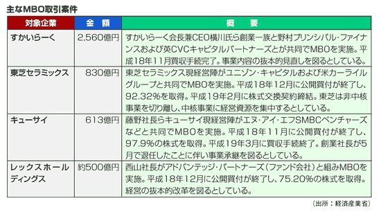 最近では、すかいらーくやレックスホールディングスなど、会社の経営者が資金を出資し、事業の継続を前提として自社の株式を購入するMBO取引が増加傾向にある。経済産業省によると、平成18年のMBO件数は80件と過去最高を記録している(右図参照)。