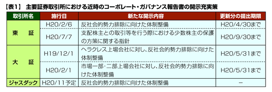 買収防衛策は上記⑤として開示されるほか、株主総会活性化への取組みなどは③として、また最近では「反社会的勢力排除に向けた体制整備」の基本的な考え方、整備状況が④の一環として開示されるようになっている(表1参照)。