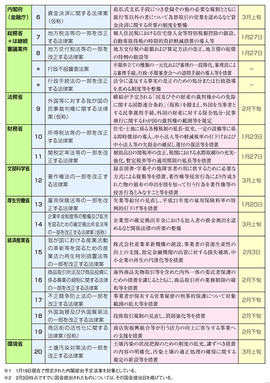 産業再生法等改正案が国会提出、廃案となった独禁法改正案は再上程へ 今国会への提出が予定される内閣提出法案等は法律案62本、条約13本(1月19日現在判明分)。これらのうち、主に企業活動に係る法律案および注目法案を20本掲げ、表とした。