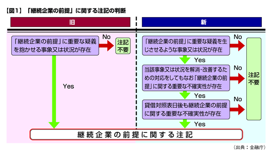 このため、今回の改正案では、継続企業の前提に重要な疑義を生じさせるような事象または状況が存在する場合であって、当該事象または状況を解消し、または改善するための対応をしてもなお継続企業の前提に重要な不確実性が認められるときなどに、財務諸表等において「継続企業の前提に関する注記」を行うこととされている(図1・2参照)。