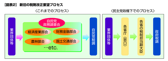 自民党政権下では、「業界団体→自民党政務調査会の各部会→自民党税調」という流れで業界団体の要望が税制改正へとつながってきたが、民主党政権下ではこのプロセスは改められ、今後、業界団体の要望は各省の税制改正担当の副大臣を通じ、(副大臣による取捨選択を経たうえで)政府税制調査会に対し伝えられることになる(図表2参照)。
