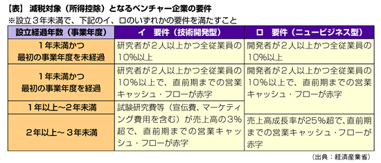 このような状況を受け、平成20年度税制改正では、従来のベンチャー企業への投資額全額を、投資を行った年の他の株式譲渡益から控除できる優遇措置に加え、ベンチャー企業への投資額(ただし、5,000円を控除)について、投資を行った年の総所得金額から控除する優遇措置との選択適用が可能になった(控除対象となる投資額の上限は総所得金額の40%と1,000万円のいずれか低い方)。