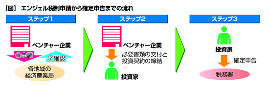 また、ベンチャー企業がエンジェル税制の対象となるかどうかについては、ベンチャー企業が資金調達の前後に経済産業局に確認することができる。ベンチャー企業がエンジェル税制の対象企業であることを確認した場合には、経済産業大臣(経済産業省)は事前確認書を発行するとともに、その旨を経済産業局のホームページで公表することとしている。このため、事前にエンジェル税制の対象企業であることが確認できることになり、投資家から資金調達をスムーズに行うことができる。なお、エンジェル税制申請から確定申告までの流れは図のとおりとなっている。