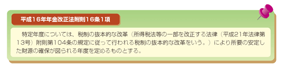 そして、平成16年年金改正法附則16条1項では、基礎年金の国庫負担割合引上げに係る特定年度について、平成21年度税制改正法附則104条により安定財源の確保が図られる年度を定めるとされている(下掲参照)。