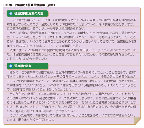 平成21年度税制改正法(本稿では所得税法等の一部を改正する法律(平成21年法律第13号)をいう)の附則104条(税制の抜本的な改革に係る措置)の存在が、国会での議論等を通じて浮上してきた。同条では、消費税を含む税制の抜本改革に係る具体的な改正内容を定める法案を、平成23年度までに提出するとしている。平成23年度までの法制上の措置については、先の臨時国会で自民党の谷垣総裁が「財政事情が緊迫化するなか、この条項の修正によるスケジュール変更は当然認められない」と発言。一方、菅首相は「期限を切っての議論ではない」と答弁している。国会がねじれ状況のもと、附則104条を巡る今後の展開が注目される。