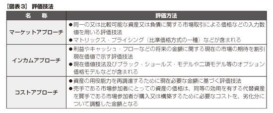(1)評価技法 公正価値を算定するための評価技法は、図表3のとおり「マーケットアプローチ」「インカムアプローチ」「コストアプローチ」に要約されるとしている。