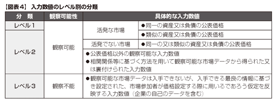 (2)レベル別の分類 公正価値を算定するにあたっては、状況に応じた、十分なデータが入手できる適切な評価技法を併用又は選択して用いなければならないとしている。また、評価技法に用いられる入力数値(脚注7)は、観察可能な入力数値を最大限利用し、観察不能な入力数値の利用を最小限にしなければならないとしている。さらに、図表4のとおり3つのレベルに分類の上、レベル1からレベル3の順に優先順位付けを行い、公正価値の算定を行うとしている。