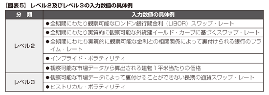 実務負担の軽減や判断基準の統一を図るため、より詳細なレベル別の分類のガイダンスとして、図表5のとおりレベル2及びレベル3の入力数値の具体例が示されている。