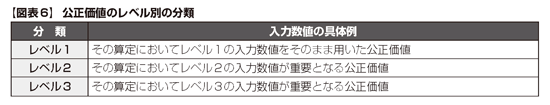 算定された公正価値は、その算定において重要な影響を与える入力数値が属するレベルに応じて、図表6のとおり3つのレベルに分類することとしている。また、評価技法に複数のレベルの入力数値が用いられた場合は、その算定に重要な影響を与える入力数値が属する最も低いレベルに分類するとしている。このため、株式や国債、社債、デリバティブといった資産又は負債の種類により形式的に分類するのではなく、公正価値を算定するにあたってどのレベルの入力数値が用いられているかを各資産又は負債ごとに確認する必要がある。このようなレベル別の分類は、公正価値の算定の首尾一貫性や比較可能性を高め、財務諸表の利用者に有用な情報をもたらすと考えられることから、コンバージェンスの観点も踏まえ、導入されたものである。