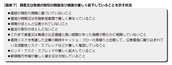 (3)資産又は負債の取引の数量及び頻度が著しく低下している場合及び秩序ある取引ではないと判断された場合における公正価値の算定 資産又は負債の取引の数量及び頻度が著しく低下しているか否かについては、入手できる情報に基づいて適切に判断する必要があるとしている。資産又は負債の取引の数量及び頻度が著しく低下していることを示す状況が図表7のとおり例示されている。