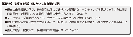 一方、秩序ある取引は、不利な条件で引き受けざるを得ない取引又は他から強制された取引ではなく、通常かつ慣習的なマーケティング活動ができるように、測定日以前の一定期間、市場にさらされていることを前提とした取引と定義されている。取引が市場参加者間の秩序ある取引であるか否かについては、入手できる情報に基づいて適切に判断する必要があるとしている。秩序ある取引ではないことを示す状況が図表8のとおり例示されている。
