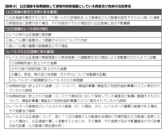 4.公正価値に関する注記事項 公正価値を毎期継続して貸借対照表価額としている資産及び負債(金融商品の一部及びトレーディング目的で保有する棚卸資産が該当)の公正価値に関して、図表9に記載されている事項を注記することを求めている。