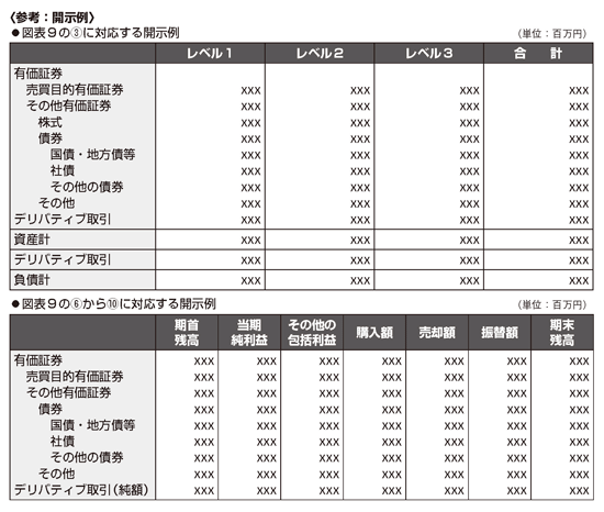 また、公正価値を毎期継続して注記している資産及び負債(金融商品(毎期継続して貸借対照表価額としているものを除く)及び賃貸等不動産)の公正価値に関して、図表9のうちレベル別の公正価値の測定額(③)を注記することを求めている。