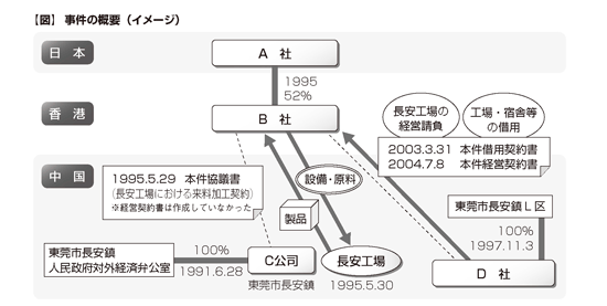 日本企業A社の香港子会社B社は、中国の郷鎮企業C公司との間で長安工場における来料加工を内容とする1995年5月29日付「協議書」(以下「本件協議書」という)を作成した(以下を含め、図参照)。その後、B社は、2003年3月31日付で、中国企業D社との間で工場・宿舎等を賃借する本件借用契約書を、2004年7月8日付で、B社がD社から長安工場の経営を請け負うという本件経営契約書をそれぞれ締結した。