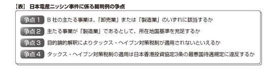 2 裁判所の判断 裁判所は、争点①について、香港は一国二制度が適用されており、独自の租税制度を有していることから、中国とは異なる「地域」に該当するとし、争点②について、B社は、その「人員及び資本の大半」を長安工場における製造業務に集中的に投下していることから、その主たる事業である製造業を主として行っているのは中国のうち香港以外の地域であり、所在地国基準を満たさないと判示した。