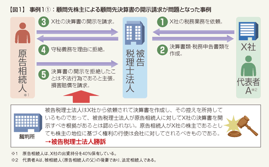 最初に紹介する裁判事案(事例1①)は、原告相続人がX会社(原告相続人が40%、被相続人が10%の出資持分を持つ非上場会社)の株主であることを理由として、X会社の決算書作成業務を行っていた被告税理士法人に対し、X社の決算書の開示を求めるとともに、被告税理士法人が原告相続人に対しX社の決算書の開示を拒絶したことが不法行為を構成するなどと主張して、被告税理士法人に対し損害賠償を請求した訴訟だ(図1参照)。