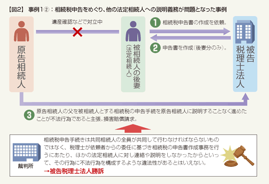 なお、本裁判事案(事例1②)で原告相続人は、他の法定相続人(被相続人の後妻。X社の代表者A)からの依頼により、相続税の申告手続を原告相続人に説明することなく進めたことなどを理由に、被告税理士法人に対し損害賠償を請求していた(図2参照)。