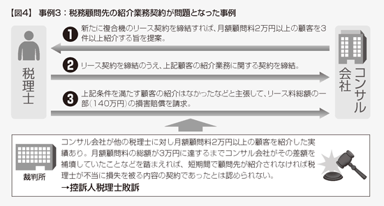 最後に紹介する裁判事案(事例3)は、税理士(兼公認会計士)がコンサル会社に対し、複合機のリース契約を締結すれば月額顧問料2万円以上の顧問先を3件以上紹介すると提案したにもかかわらず、条件を満たす顧客が紹介されなかったなどと主張して損害賠償を請求した訴訟だ(図4参照)。