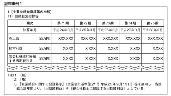 記載事例1は当該改正を反映した主要な経営指標等の推移の記載事例である。なお、当期純利益等の表示の変更については注意喚起することが望ましいと考えられることから、(注)3.において注記を行っている。
