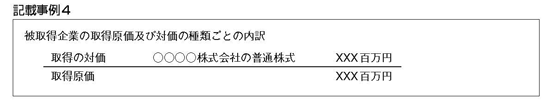 記載事例4は、取得による企業結合が行われた場合の注記における、被取得企業又は取得した事業の取得原価及び対価の種類ごとの内訳の記載事例である。改正前は、取得とされた企業結合における取得関連費用のうち一部については、取得原価に含めることとされていたが、企業結合会計基準等の改正により、取得関連費用は発生した連結会計年度の費用として取扱われるため、当該内訳の記載においてアドバイザリー費用等取得に直接要した費用の記載は行わないものと考えられる。