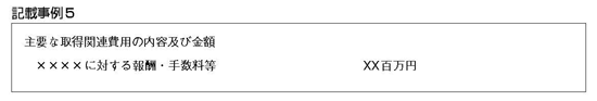 取得関連費用については、主要な取得関連費用の内容及び金額の記載が求められている(連結財規第15条の12第1項第5号)。この記載にあたっては、記載事例5を参考としてほしい。