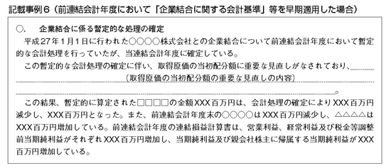 記載事例6は前連結会計年度において企業結合会計基準等を早期適用している場合の記載事例である。これは、企業結合会計基準等を原則適用した場合、暫定的な会計処理の定めは当連結会計年度の期首以後実施される企業結合から適用することから、暫定的な会計処理が確定するのは早くとも翌連結会計年度であり、当連結会計年度においては当該注記を記載するケースは存在しないためである。