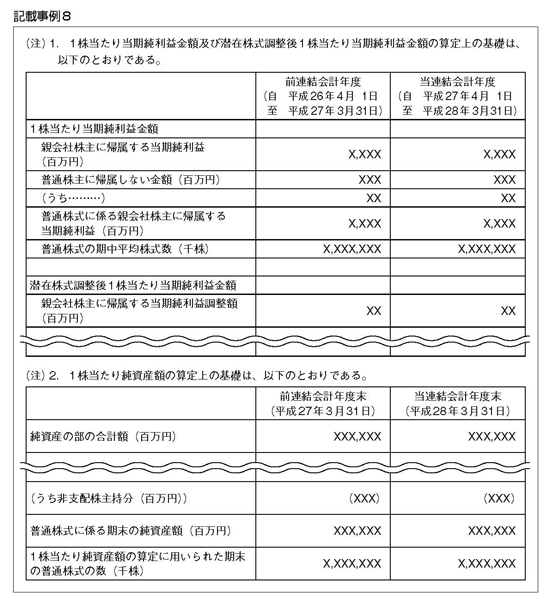 6 一株当たり情報 記載事例8は一株当たり情報の注記における算定上の基礎の記載事例であり、当期純利益等の表示の変更に伴い、記載を一部見直している。