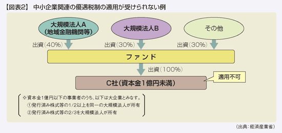 事業承継税制については、既存の制度の要件の見直しに加え、後継者がいないため事業承継が行えない、あるいは投資余力がないため事業継続が困難といった課題を抱える中小企業においては事業を売却したりM&Aにより事業を再編・統合を図ることが行われている実態を踏まえ、①株式、事業の譲渡益に係る税負担の軽減、②不動産の移転及び地上権等の設定に係る登録免許税の軽減、③不動産の所有権移転に係る不動産取得税の軽減措置を講じる。また、ファンドから出資を受けた後に事業承継を行うこともあるが、ファンドの出資を受けたことにより大企業とみなされ中小企業関連の優遇税制の適用が受けられないケースがあるため、この要件を緩和することを求めている(図表2参照)。