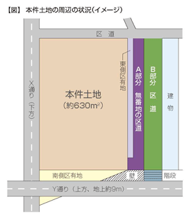 固定資産評価額が問題となった本件土地(法人である納税者の事務所が所在)は、北側に区道、東側に区有地及び無番地区道(以下「A部分」)、そのさらに東側に区道(以下「B部分」)、南側に区有地(その9m上にはY通りが存在)、西側にX通りが沿接していた(図参照)。