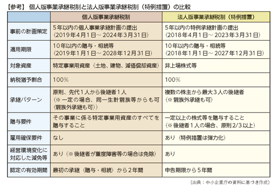 A 個人版事業承継税制は10年間の期間限定措置として導入された。具体的には、2019年1月1日から2028年3月31日までの間に贈与・相続等により取得する特定事業用資産に係る贈与税又は相続税に適用される。ただし、特例を受けるには2019年4月1日から2024年3月31日までに「個人事業承継計画」を作成し、都道府県に提出しなければならない(計画の作成には認定経営革新等支援機関の指導及び助言を受けることが必要)。前述した通り、個人事業承継計画の提出が期限内になければ、その後、個人版事業承継税制の適用を受けることができない。