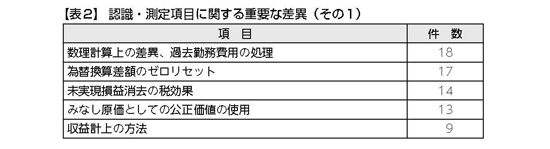 米国会計基準とIFRSとの間の認識・測定項目に関する重要な差異として、調整表で説明されていた項目の上位5件は、以下の表2のとおりである。