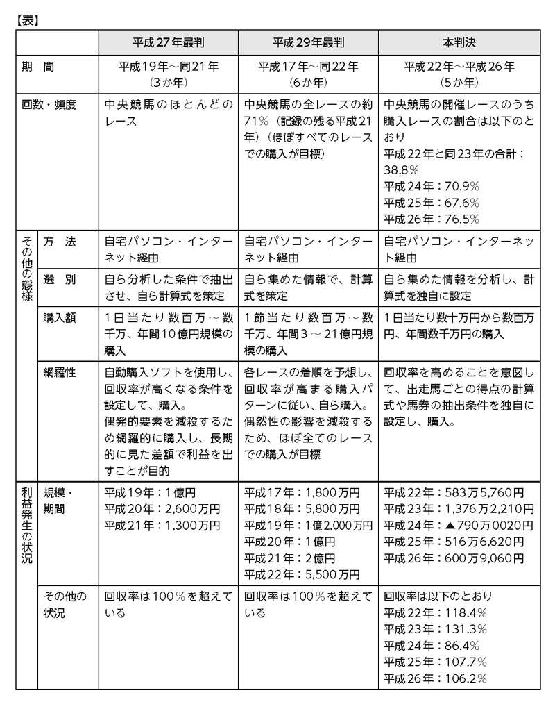本件の事案と平成27年最判や平成29年最判の事案との差異としては、平成24年の回収率が100%に満たず、損失を発生させている点や、馬券を購入する回数・頻度が低い点が挙げられる。