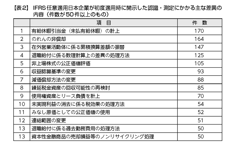 次に、IFRS任意適用日本企業が、IFRSを初度適用する際に、日本基準とIFRSとの差異として説明していた認識・測定に係る項目を、企業数が多い(開示の件数が50件以上のもの)順に列挙すると、次の表2のとおりであった。有給休暇引当金(未払有給休暇)の計上、のれんの非償却、在外営業活動体に係る累積換算差額の振替及び退職給付に係る数理計算上の差異の処理方法については、ほとんどのIFRS任意適用日本企業が、日本の会計基準とIFRSとの間の差異として開示を行っていた。