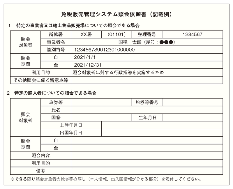 輸出免税、輸出物品販売場に係る行政指導では、「申告内容等のお尋ね」(輸出免税用)または「申告内容等のお尋ね」(輸出物品販売場用)に「事業概況回答書」(免税取引に係る事業概況として、取引商品、商品の管理場所、輸出手段(船便・航空便・EMS・その他)、決済手段、作成書類を記載)を添付して送付することで、納税者等から検討に必要な資料をサンプル的に徴求し、取引実態を踏まえて「消費税還付審査チェックシート(輸出免税用)」または「消費税還付審査チェックシート(輸出物品販売場用)」による実態解明が行われます。その際、還付原因が輸出物品販売場によるものと想定される場合は、「免税販売管理システム照会依頼書」(前頁参照)を作成し、局消費税課を通じて、購入記録情報の照会が行われます。