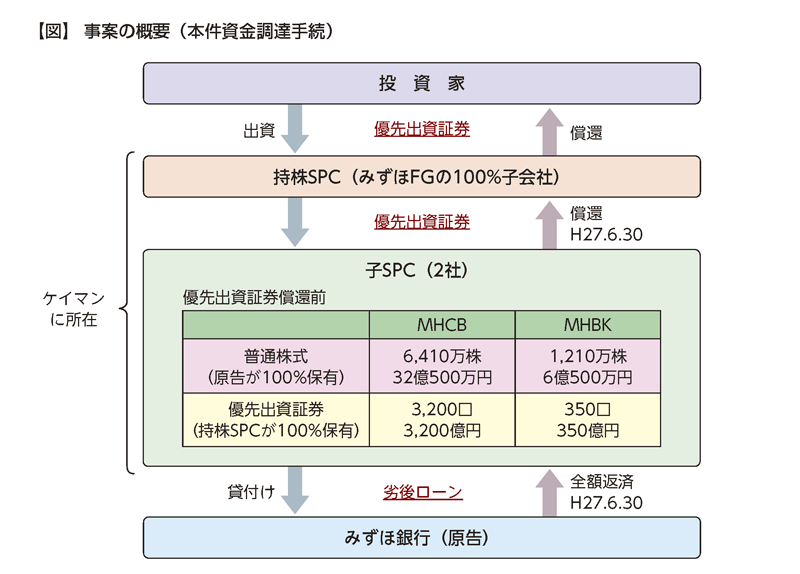 みずほ銀行は特定外国子会社等に該当する各子SPCの発行済普通株式の全部を保有していたが、各子SPCの優先出資証券は、みずほFGの100%子会社であるケイマンSPCが全て保有していた。しかし、各子SPCは期中において優先出資証券の全部を当該ケイマンSPCに償還したため、各子SPCが事業年度終了日において発行する株式等は、みずほ銀行が100%保有する普通株式のみとなっていた(図参照)。
