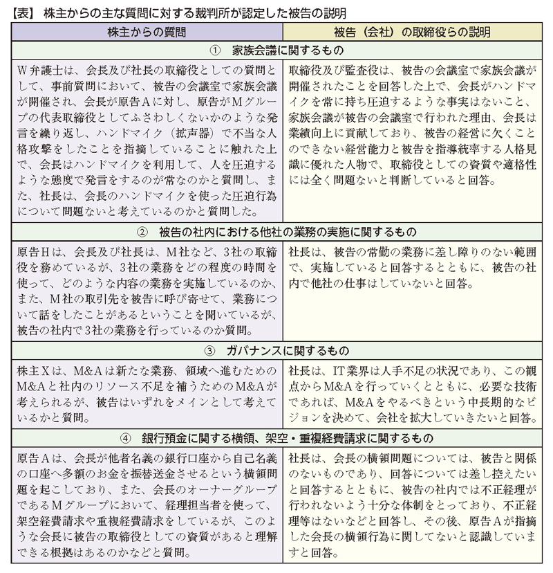 本件において、原告らが説明義務違反として主張するのは、被告の取締役及び監査役の選任に係る議題についての取締役候補者の資質に関する質問及び回答についてであり、その具体的内容としては、①家族会議に関するもの、②被告の社内における他社の業務の実施に関するもの、③ガバナンスに関するもの、④銀行預金に関する横領、架空・重複経費請求に関するものであるとし、それぞれ説明義務違反があったか否かについて判断を行っている(表参照)。