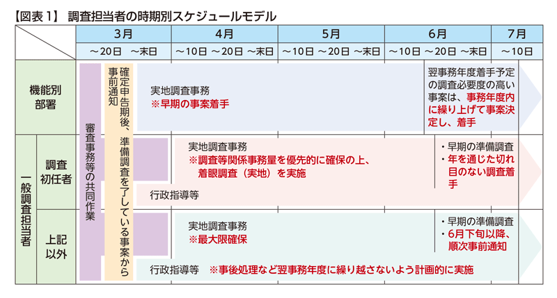 (3)早期着手に向けた準備では、定期人事異動前後の調査事務量を有効に活用するため、早期着手(7・8月着手)する事案について、準備調査、調査予約を計画的に実施するとしています。