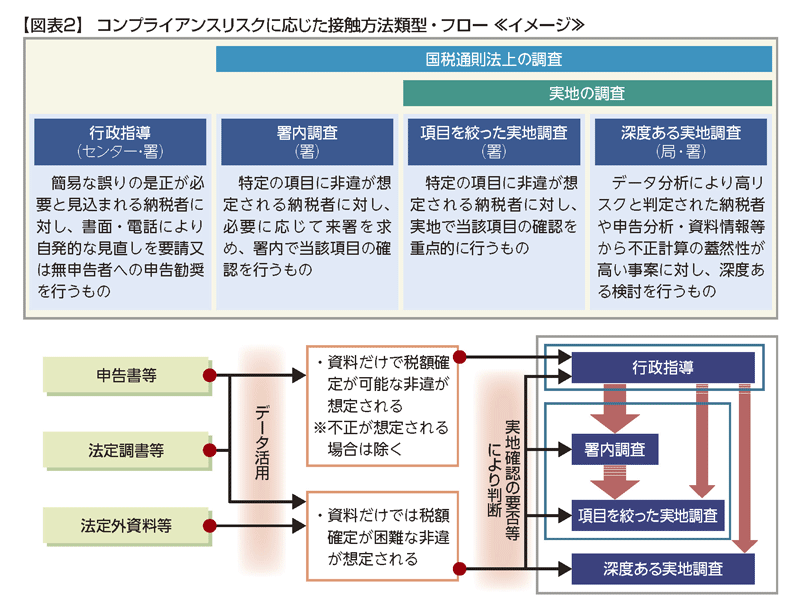 コンプライアンスリスクに応じた接触方法については、4類型(行政指導、署内調査、項目を絞った実地調査、深度ある実地調査)が示されています(図表2参照)。