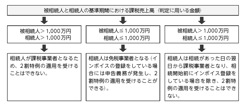 判定に用いる金額が1,000万円以下の場合には、相続人は免税事業者となることができるとともに、インボイス登録をしている場合には、課税事業者として申告義務が発生し、2割特例の適用を受けることができる。