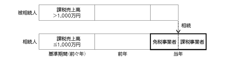 相続のあった年は、被相続人の基準期間における課税売上高が1,000万円を超える場合には、相続のあった日の翌日から年末までの期間については、相続人は課税事業者となる(消法10①)。