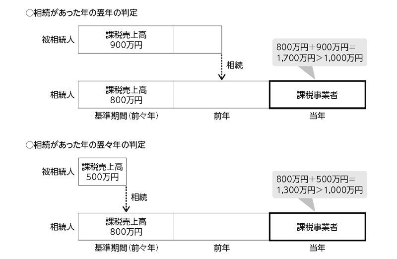相続のあった年の翌年及び翌々年については、相続人が事業を営んでいる場合には、相続人と被相続人の基準期間の課税売上高の合計額が1,000万円を超えると相続人は課税事業者となる(消法10②)。相続があった年の判定とは異なり、相続人と被相続人の課税売上高を合計して判定することに注意が必要だ。