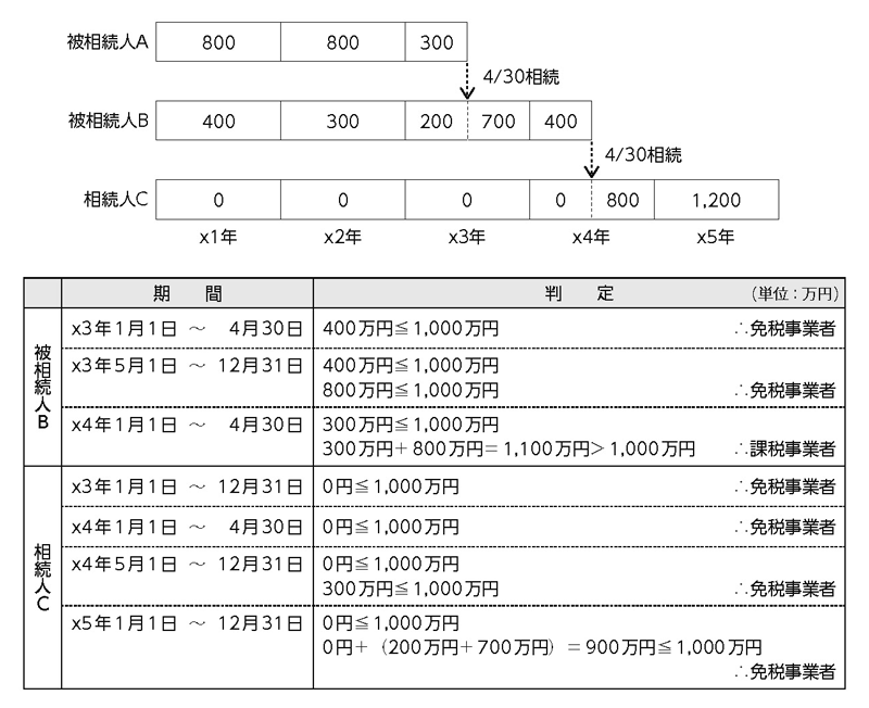 また、Cのx4年とx5年の納税義務は、被相続人Aの課税売上高は考慮せずに、Cと被相続人Bの課税売上高により判定する。